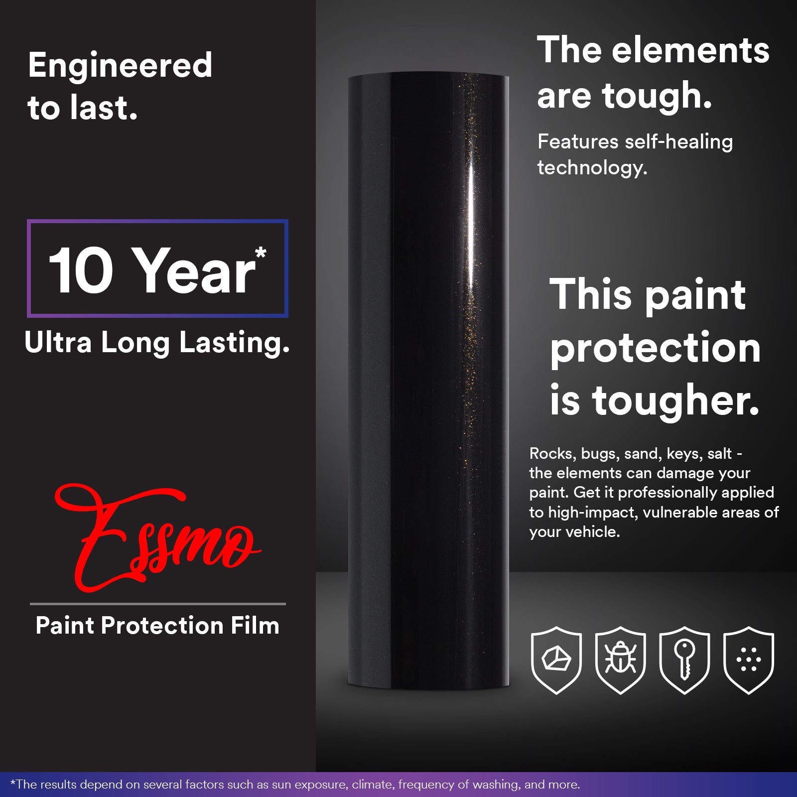 Assuming proper care and storage, ESSMO PPF will last against cracking, bubbling, or yellowing for up to five years from the date of purchase of the Product.