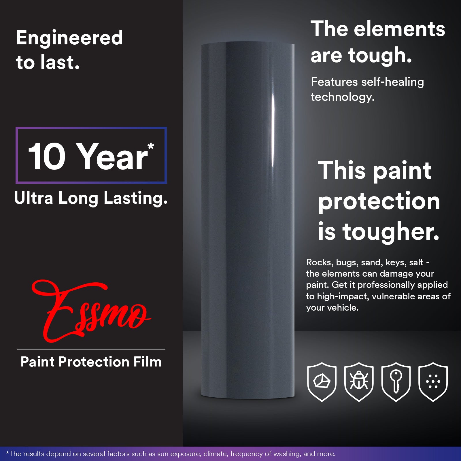 Assuming proper care and storage, ESSMO PPF will last against cracking, bubbling, or yellowing for up to five years from the date of purchase of the Product.